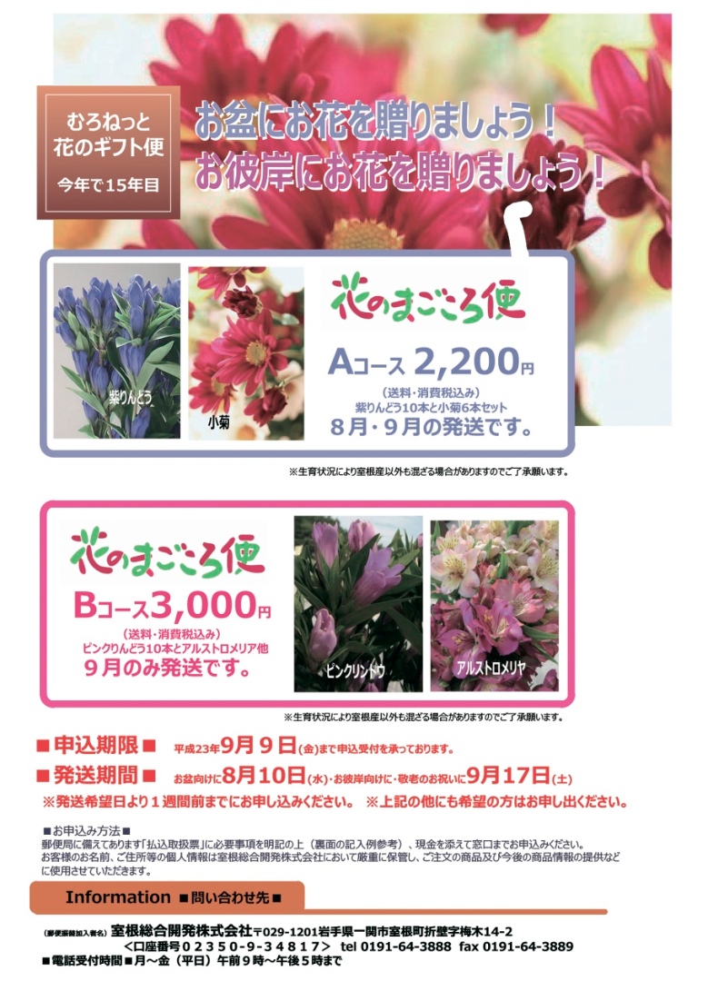- 発送期間:[お盆向け]平成23年8月10日(水)、[敬老の日、お彼岸向け]9月17日(土)