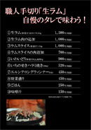 単品 料金(消費税別) 生ラム(野菜付) 1,300円 生ラム追加 1,000円 ラムスライス(野菜付) 1,000円 ラムスライス追加 700円 いわいどり(野菜付) 900円 いちのせきハラミ焼き 520円 エルンテソーセージ 450円 野菜盛り 450円 ごはん 250円 味噌汁 150円 セット 料金(消費税別) ファミリー焼肉セット 3,300円 盛合せ焼肉セット 3,800円 得々ファミリー焼肉セット 6,500円 得々盛合せ焼肉セット 6,800円
